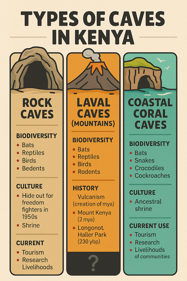 Caves Caves are natural subterranean voids large enough for human access, and accommodating cave adapted organisms. Based on the origin and formation, there are three major types of caves in Kenya and indeed most parts of the World: